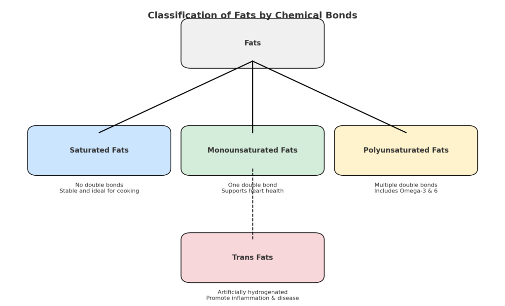 Biochemically, fats — or lipids — are chains of carbon, hydrogen, and oxygen atoms. They don’t dissolve in water, which makes them perfect for forming the walls of every cell in your body. Most of the fat you eat exists as triglycerides, built from one glycerol backbone and three fatty acids. Those fatty acids determine how the fat behaves inside you — whether it fuels energy, builds hormones, or inflames your tissues.