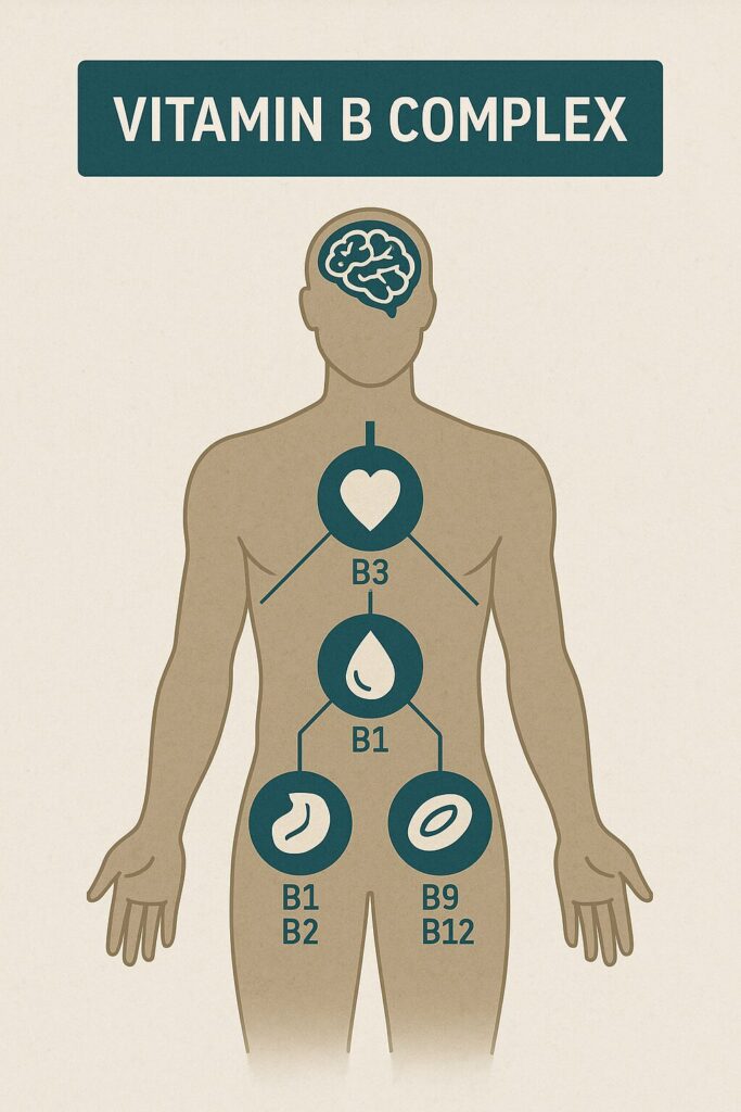 Vitamin B Complex is the biological “engine oil” that keeps your metabolism running smoothly. It supports everything from energy production and brain chemistry to recovery and mood regulation.